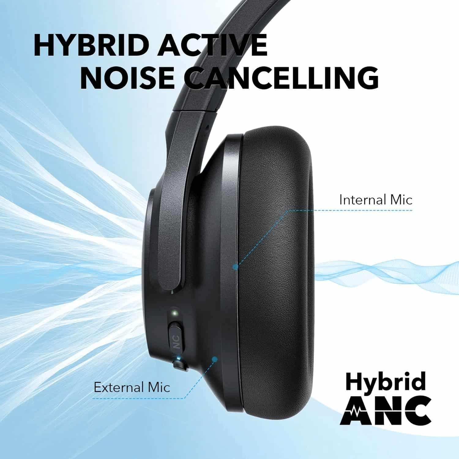 یکی از نقاط تمایز مهم این مدل، فناوری Hybrid Active Noise Cancelling (ANC) آن است. هدفون دارای دو میکروفون داخلی و دو میکروفون خارجی است که نویز محیط را تا حدود ۹۰٪ کاهش میدهند (مثلاً صدای موتور هواپیما، کولر، سروصدای شهری). soundcore+1 به عبارتی، در محیطهای پر سروصدا نیز میتوان از Q20i استفاده کرد و تجربهی شنیداری آرامتری داشت.